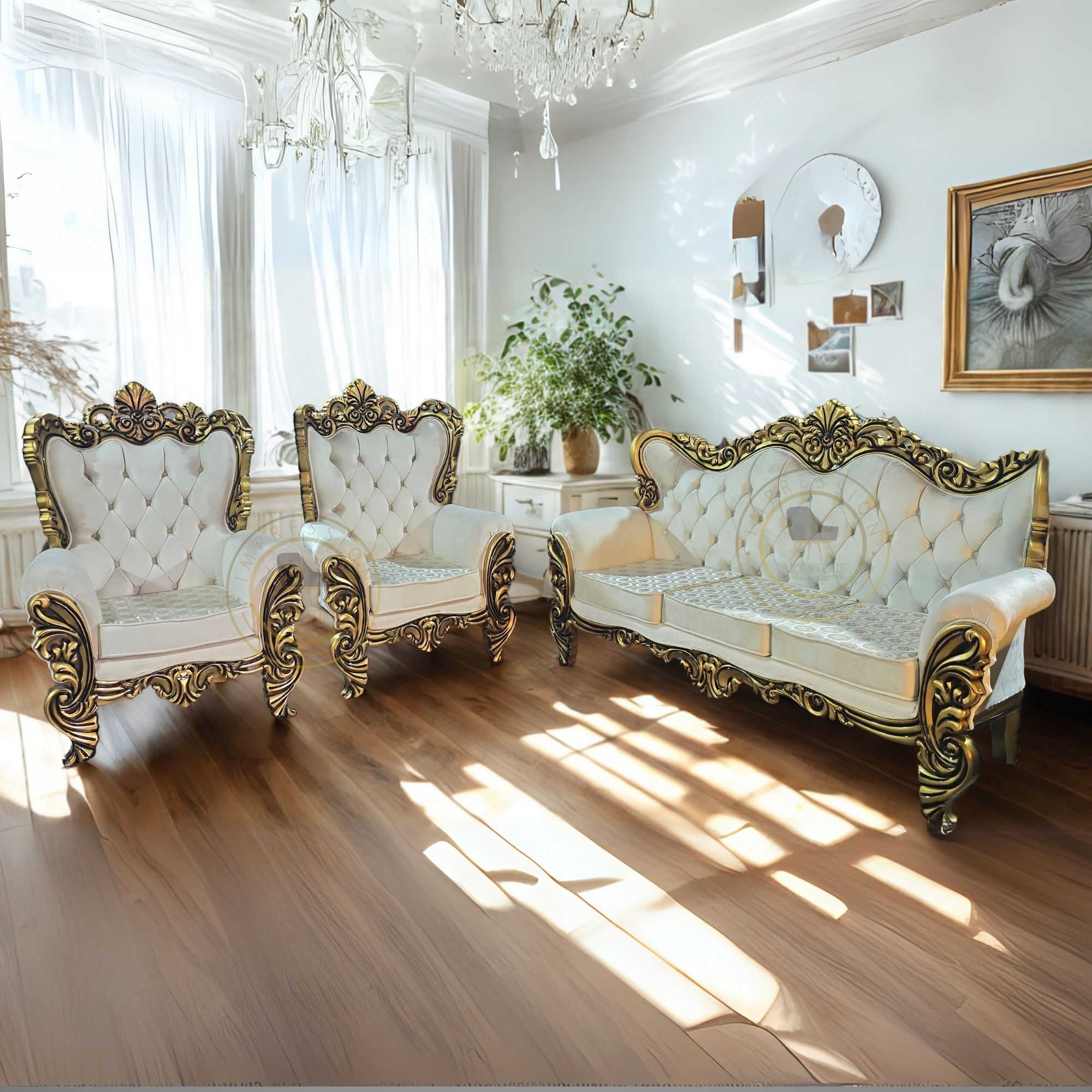 Wood 5-Seater Sofa Set | 3+1+1 Seating | 40 Density Cushions | Gold Carving Design