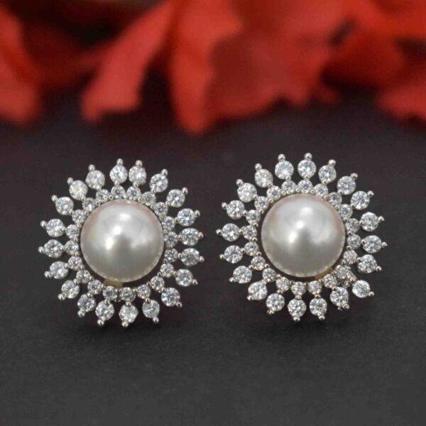“Delicate American Diamond ear studs with lustrous pearls, rhodium-plated for a long-lasting shine. Perfect for everyday elegance or special occasions.”