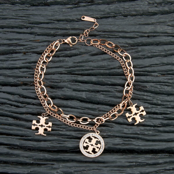 Premium rose gold plated charm bracelet featuring American diamond detailing and an elegant Tory Burch inspired charm design. Crafted for a sophisticated and modern look, this bracelet adds a touch of luxury to any outfit. The high-quality plating ensures long-lasting shine and durability, while the lightweight and comfortable fit makes it perfect for everyday wear as well as special occasions. A stylish accessory that complements both ethnic and western outfits, making it an excellent choice for personal use or gifting.