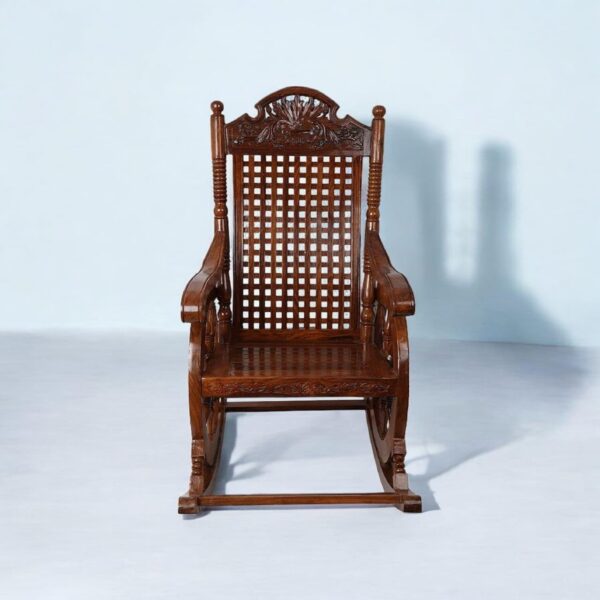 Handcrafted from solid hardwood, this rocking chair showcases timeless durability and natural beauty. The warm, polished wood grain enhances its vintage charm.