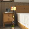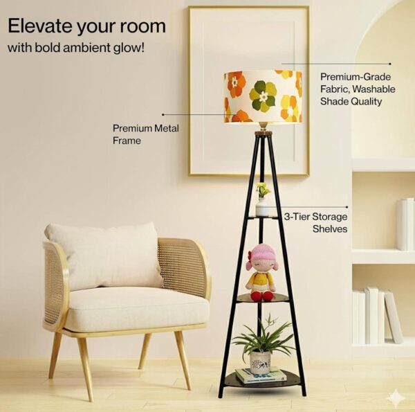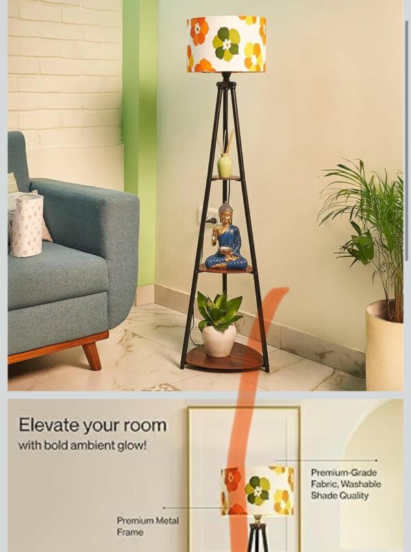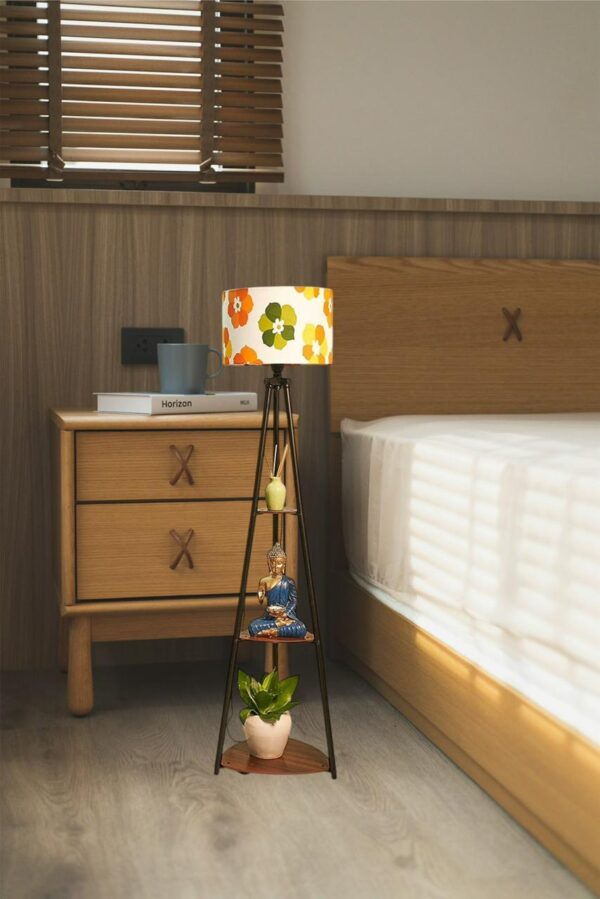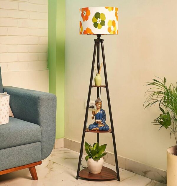 Stylish tripod floor lamp with colorful floral lampshade aur built-in wooden shelves. Lighting aur décor dono ke liye perfect modern home accessory.