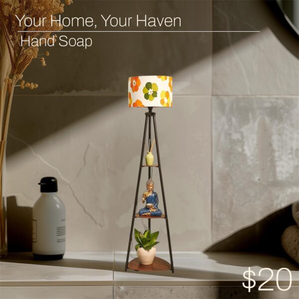 Lamp ka strong metal tripod stand stability provide karta hai, jabki multiple wooden shelves aapko décor items jaise idols, plants, books ya aroma diffusers rakhne ki space dete hain.