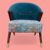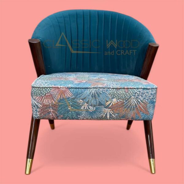 A modern designer accent chair featuring a plush velvet backrest and a vibrant printed fabric seat, elegantly supported by sturdy teak wood legs. Perfect for adding style and comfort to any living space.