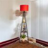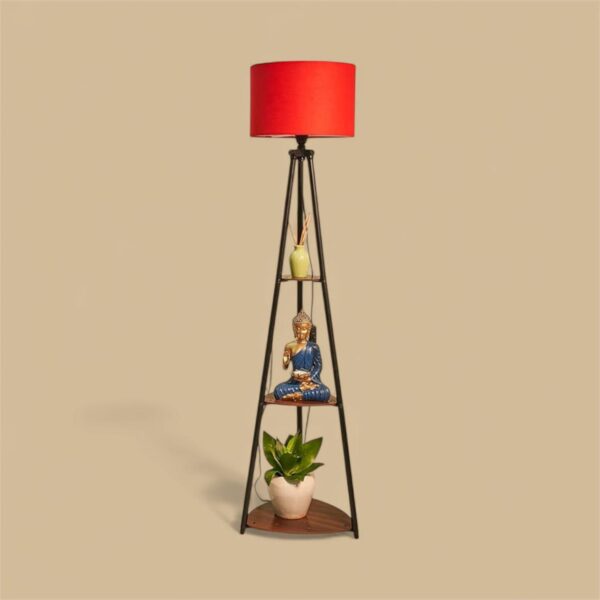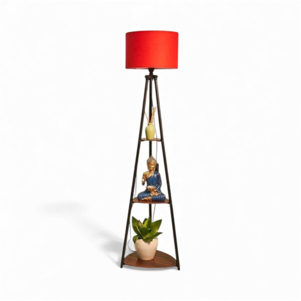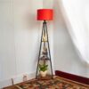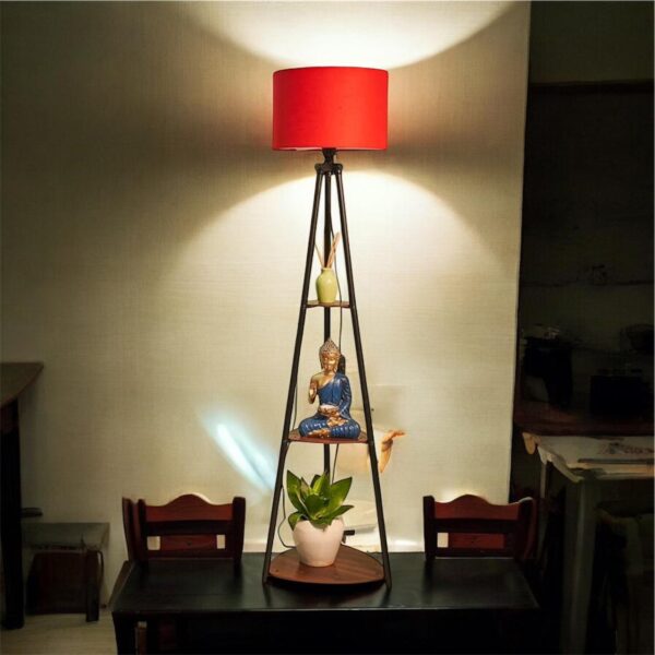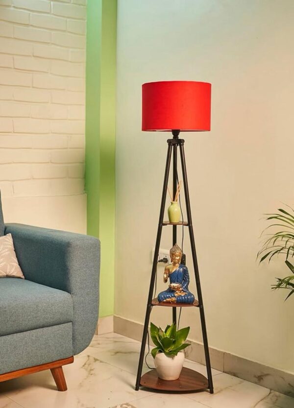 Stylish tripod floor lamp featuring a bold red fabric shade and built-in wooden shelves. Perfect blend of ambient lighting and functional home décor.