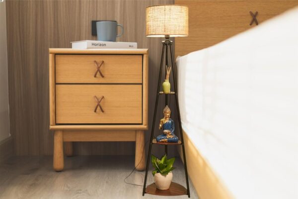 Elegant aur multifunctional floor lamp with wooden shelves, jo lighting ke saath-saath décor aur storage ka perfect combination hai. Living room, bedroom ya office ke liye ideal.