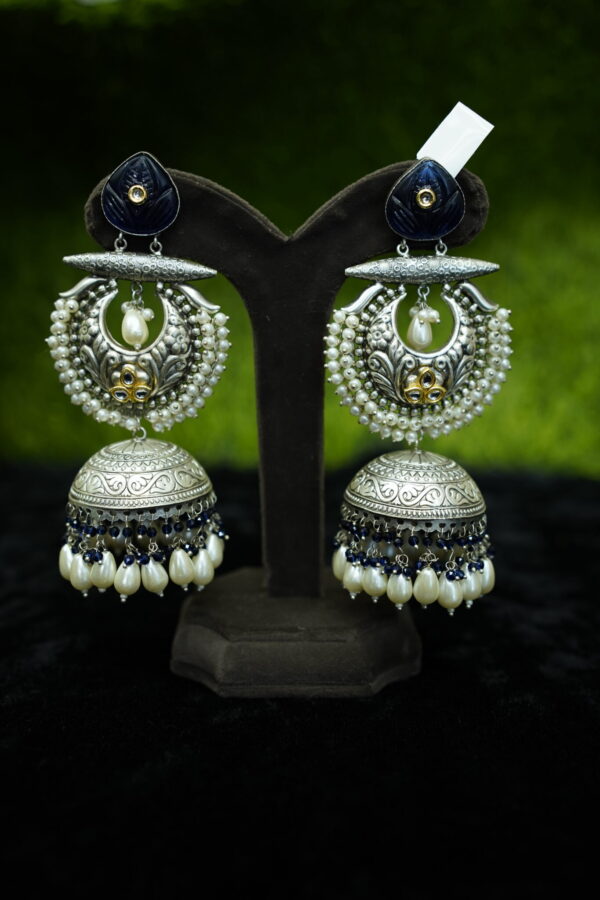 Oxidised Silver Pearl Jhumki 1 – Beautifully crafted with intricate oxidised detailing and delicate pearl drops, these classic jhumkis add timeless ethnic charm to any traditional outfit.