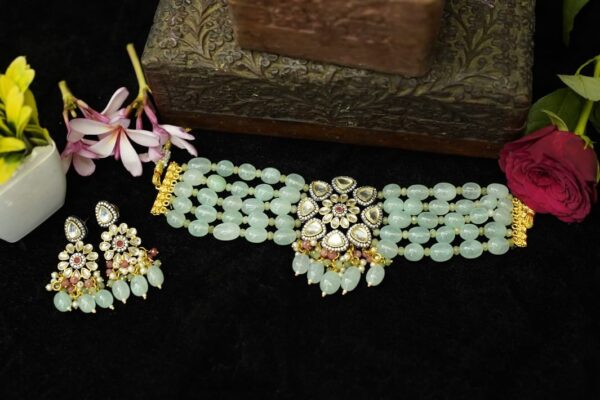 Traditional Mint Beads Gold Plated Polki Choker Set With Earrings