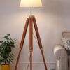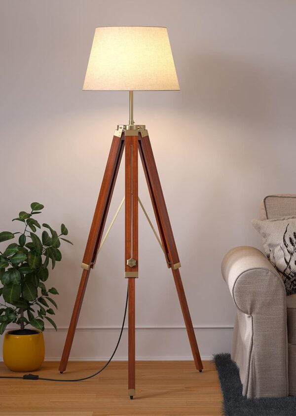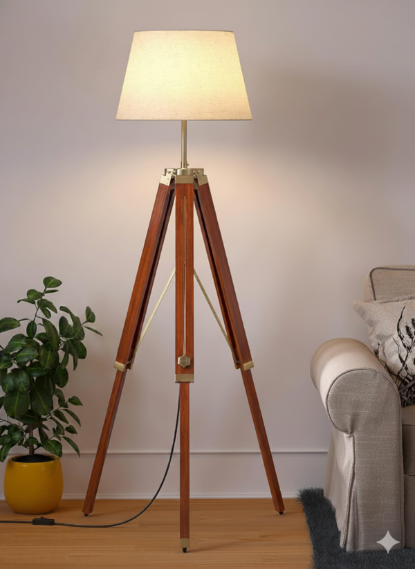 A stylish tripod floor lamp featuring a warm wooden base with elegant brass-finish accents, topped with a classic fabric lampshade. Perfect for adding ambient lighting and a modern yet timeless touch to living rooms, bedrooms, or reading nooks. Adjustable height and sturdy design make it both functional and decorative.