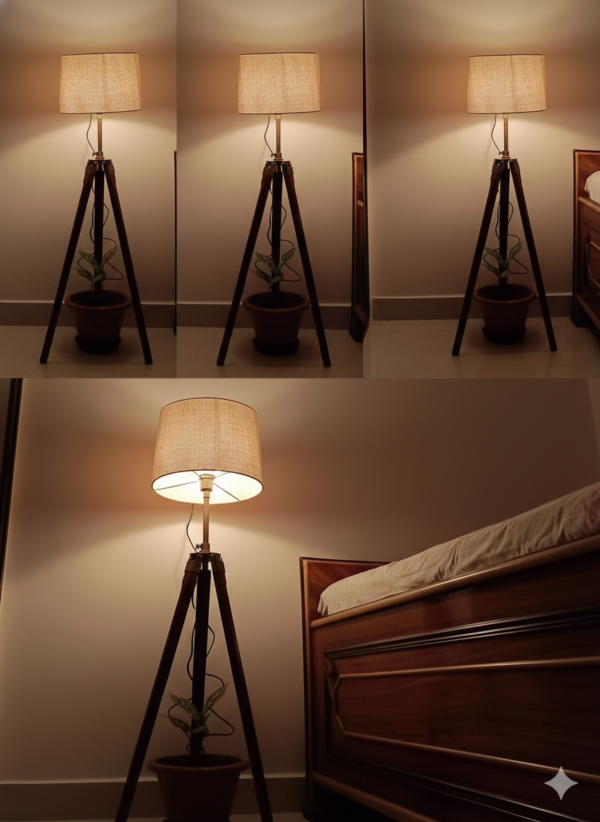 A stylish tripod floor lamp featuring a warm wooden base with elegant brass-finish accents, topped with a classic fabric lampshade. Perfect for adding ambient lighting and a modern yet timeless touch to living rooms, bedrooms, or reading nooks. Adjustable height and sturdy design make it both functional and decorative.