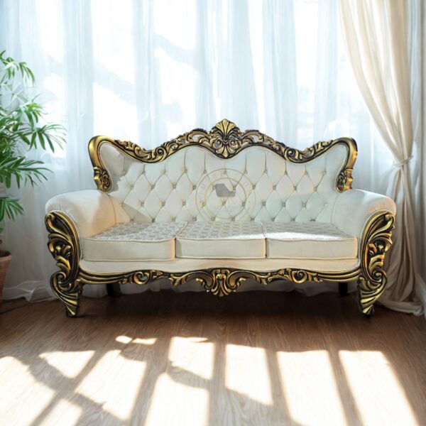 Upgrade your living room with this elegant Wood 5-Seater Sofa Set designed in a comfortable 3+1+1 seating layout. Crafted from quality wood, this sofa features premium 40 density cushions for superior comfort and long-lasting support. The luxurious gold carving design adds a royal and designer touch, making it an ideal choice for modern and traditional interiors. A perfect blend of durability, comfort, and style.