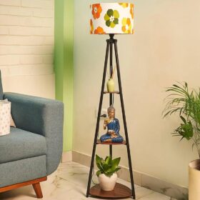Designer Tripod Floor Lamp with Floral Fabric Shade & Wooden Shelves | Decorative Standing Lamp for Living Room & Bedroom